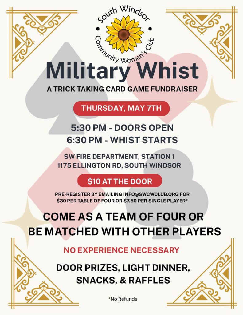 The South Windsor Community Women's Club is a non-profit, volunteer organization open to all women who donate their time and talents for the betterment of our community in the areas of the Arts, Conservation, Current Affairs, Education, Health and Homelife.